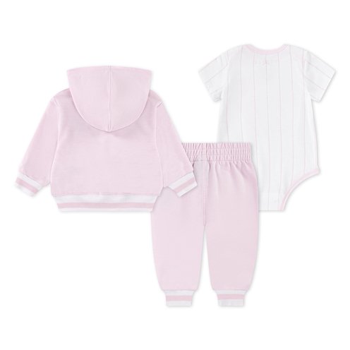 Looking for an easy way to outfit your little one when the weather starts to get a little chilly? This 3-piece set includes a zipped hoodie, matching jogger pants and a cute short-sleeve bodysuit with the iconic Jordan 23 logo, has you both covered.