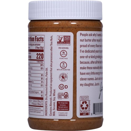 Per Serving: 6 g protein (4% Daily Value); 1 g total sugars. Certified gluten free. Not a low calorie food. Non-GMO Project verified. Naturally delicious. People ask why I named Justin's nut butter after myself. It's because I'm proud of every flavor we craft. Because I've dedicated years to perfecting my one-of-a-kind grinding process. And because, after all the hard work it takes to make these naturally delicious recipes, I have very little energy to come up with clever names. Just ask my son, Justin, or my daughter, Justin. - Justin. Pollinator friendly. Orangutan Friendly: Palm oil .
