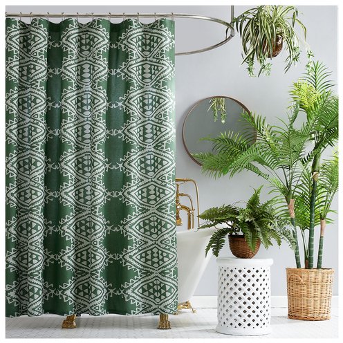 Inspired by trims from Justina Blakeney's vintage textile collection, this shower curtain in soothing sage and grey invites in a fresh mood, while the geometric motif brings serenity and a bit of eclectic�glamour to a bathroom.�