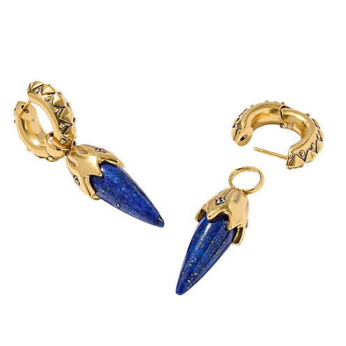Cute and convertible, the Catherine Gold Huggie Earrings are about to be the star of your earring collection. Our bestselling Mikki Huggie Earrings get reimagined with an antique-inspired finish and prismatic detailing for extra dimension. And the blue lapis claw charms are removable, so you can wear these earrings multiple ways, for either a subtle or statement look.
