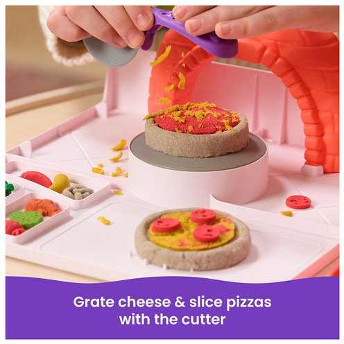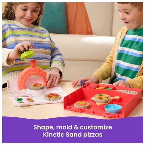 Create magically rising pizzas with Kinetic Sand SquishPizza. This pizza oven playset will inspire little chefs to shape, mold and customize their own pizzas. With 1 pound of Kinetic Sand in 4 colors, 2 squishers and 3 tools, kids can prep by molding topping shapes like pepperoni and vegetables, then squish down their pizza creations, watching them pop up and rise like a real pizza, sparking imaginative pretend play. Shred cheese with the cutter’s handle, mix sand colors together, mold gummy bears and strawberries for a wacky pizza and more. SquishPizza’s pizza box case keeps play contained and makes it easy to take the toy kitchen fun on the go. Kinetic Sand aids in the development of fine motor skills and sensory skills, and is suitable for individual or group play, encouraging social interaction. A must-have gift for those who enjoy play kitchens, SquishPizza is an engaging craft kits alternative to modeling clay and building toys. The One and Only Kinetic Sand is made from natural sand, never dries out, and sticks together for easy cleanup. Get your hands in the sand with more colors of Kinetic Sand (each sold separately). Feel the fun with Kinetic Sand for kids.