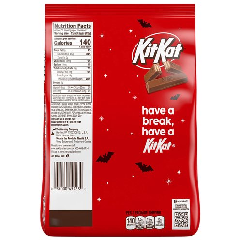 Crisp wafers in milk chocolate. 140 calories per 2 packages. Per 2 Package Serving: 140 calories; 4.5 g sat fat (23% DV); 15 mg sodium (1% DV); 15 g total sugars. Have a break, have a KitKat.