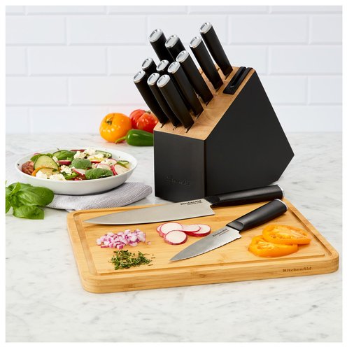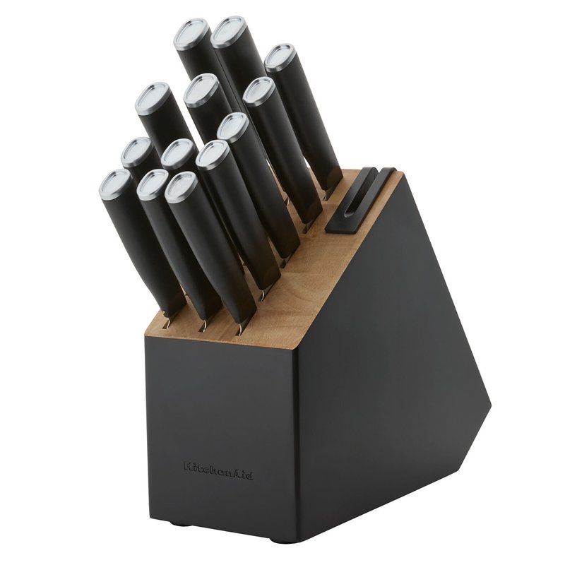 This KitchenAid 14-piece knife block set is a must-have for any culinary enthusiast or home chef. Crafted from semi-polished, high-carbon Japanese steel, these blades are hardened and tempered to ensure a durable edge for professional-quality cuts every time. Housed in a sleek and compact two-tone block with a natural wood finish on top and a black body, this comprehensive set includes an array of knives, each serving a specific purpose: an 8-inch chef knife, an 8-inch slicing knife, a 5.5-inch serrated utility knife, a 5-inch santoku knife, a 4.5-inch fine-edge utility knife, a 3.5-inch paring knife, a 3.5-inch serrated paring knife, and six 4.5-inch steak knives. The slim design of the block makes it ideal for kitchens with limited counter space, providing convenience without compromising on functionality. Additionally, the block features a built-in sharpener for easy maintenance. Ergonomic handles, designed for optimal control and comfort, are accented with chrome endcaps, adding a touch of elegance. With its razor-sharp performance, elegant design, and aesthetic appeal, this KitchenAid knife block set is the perfect addition to your kitchen, ensuring you're always prepared for any meal prep needs. These KitchenAid knives are dishwasher safe on the top rack for convenient cleanup, though hand washing is recommended for extended longevity. Dry immediately for best results.