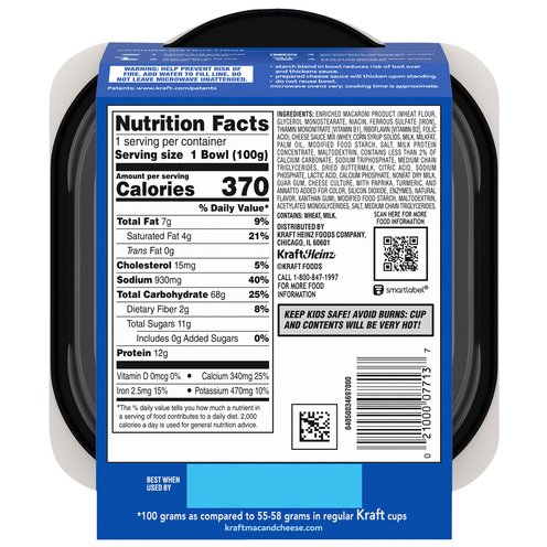 No artificial flavors, preservatives, or dyes. Per Bowl: 370 calories; 4 g sat fat (21% DV); 930 mg sodium (40% DV); 11 g total sugars. Ready in 3.5 minutes. 70%* more mac & cheese. * 100 grams as compared to 55-58 grams in regular Kraft cups.