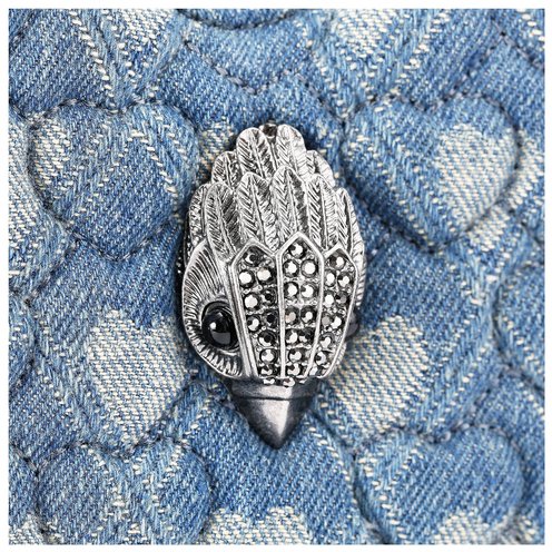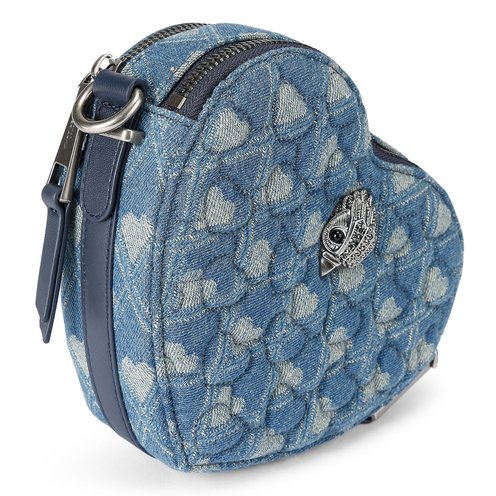 This Dual Zip Kensington Heart Bag arrives in a soft denim fabric with bleached heart design across the exterior. There is a simple antiqued silver eagle head sat on the front of the bag.