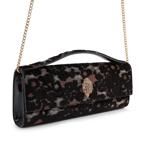 A jewel-encrusted eagle head stands out at the flap of a velvety-soft fabric bag shaped in a slender profile and suspended from an optional chain strap for hands-free wear.