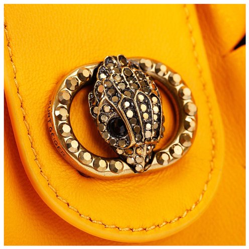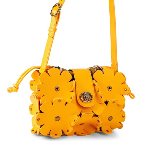 This Chelsea Flowers Purse is crafted from a mustard leather 3D flowers which each have an antiqued brass cut out at the centre. There is an antiqued brass oval trim on the flap over with eagle at the centre.