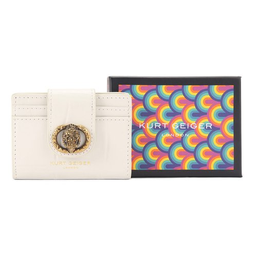 This Chelsea Card Wallet is crafted from a soft croc embossed bone leather. There are four card slots on the exterior and a flap closure. There is an antiqued brass oval trim and eagle head embellished with crystals on the flap closure.