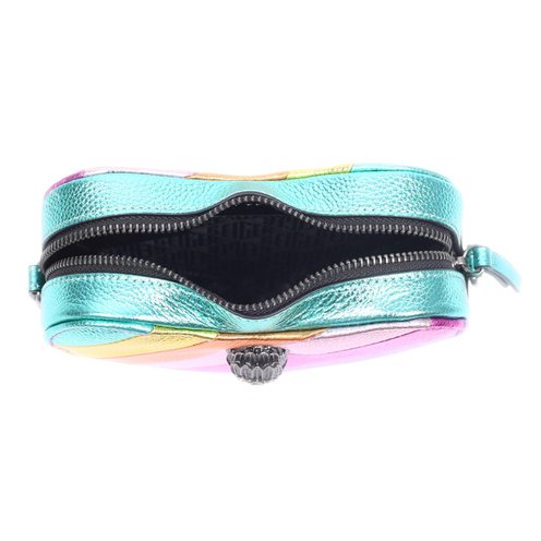 The Kensington Heart Bag is crafted from a metallic laminated pebble grain cow leather in the iconic diagonal rainbow sewn stripe pattern. The antiqued silver Eagle head features rainbow colored crystals and black bead eyes on the front.