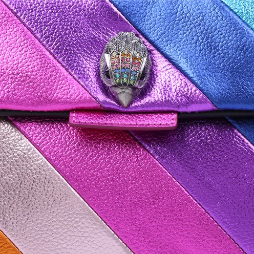 The Kensington Cross Body Purse features a soft lambskin leather structured exterior with signature padded overstitch quilting in a weave pattern. The antiqued brass Eagle head features opaque brass crystals and black bead eyes on the front.