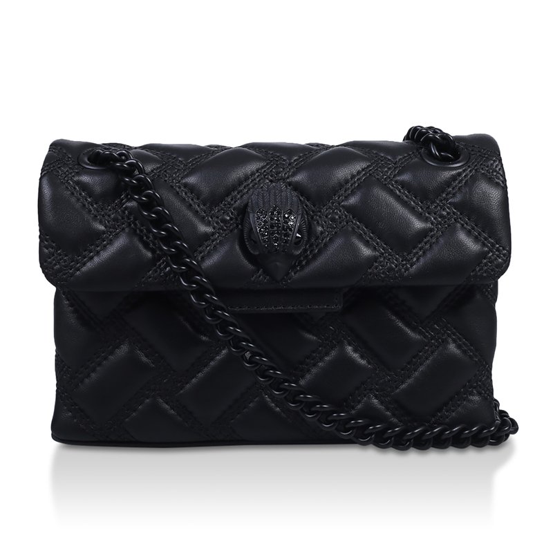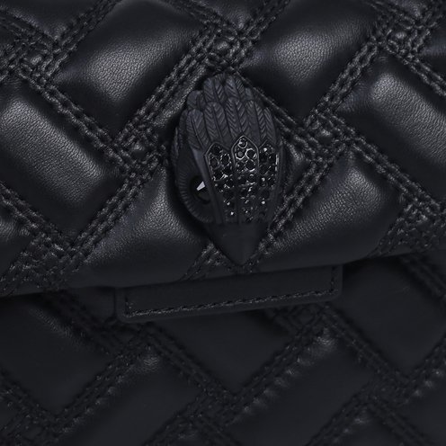 The Mini Kensington Drench Bag is crafted from a soft lambskin leather with signature parquet padded overstitch quilt with three rows of weave pattern. The black metal Eagle head features jet black crystals and black crystal eyes on the front flap.