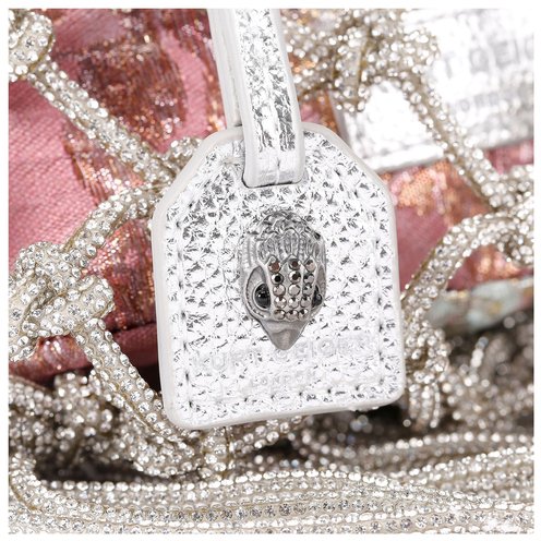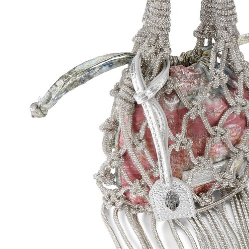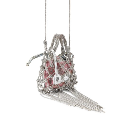 This Mini Macrame crystal bag has a silver crystal embellishment across the knotted structure. There is a crystal antiqued silver eagle head on the pebble grain luggage tag.