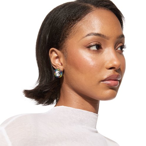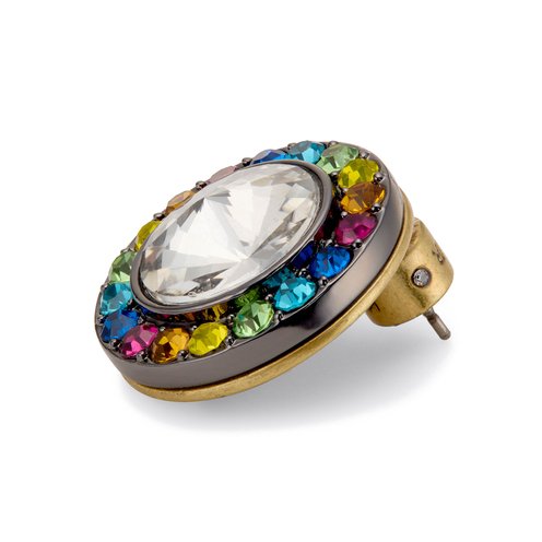 Sophisticated stud earrings featuring crystal gemstone haloed with delicate rainbow stones. Posts are made from hypoallergenic titanium perfect for everyday. Earrings have a post back closure. Made from brass, glass crystal and titanium.