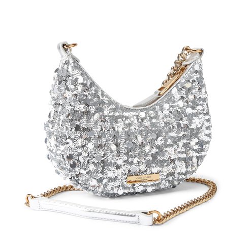 This Small Chelsea Hobo purse features a silver sequin exterior with crystal embellishment. There is a gold chain shoulder strap accented with an oval trim with crystal eagle head at the centre of the small shoulder strap.