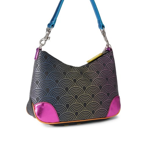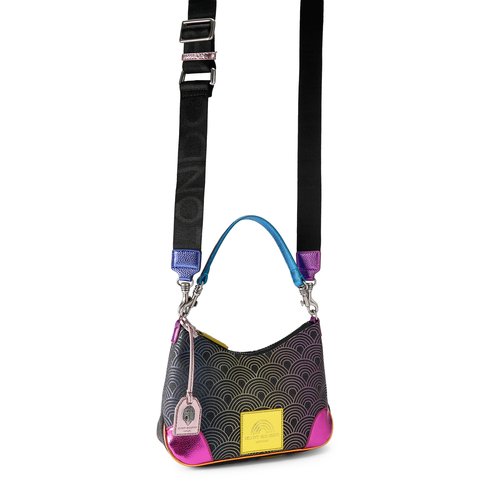 This Small Southbank Hobo bag is crafted from canvas fabric that is embellished with ombre rainbow print. There is a metallic pink luggage style tag on the top handles that is topped with an antiqued silver eagle.