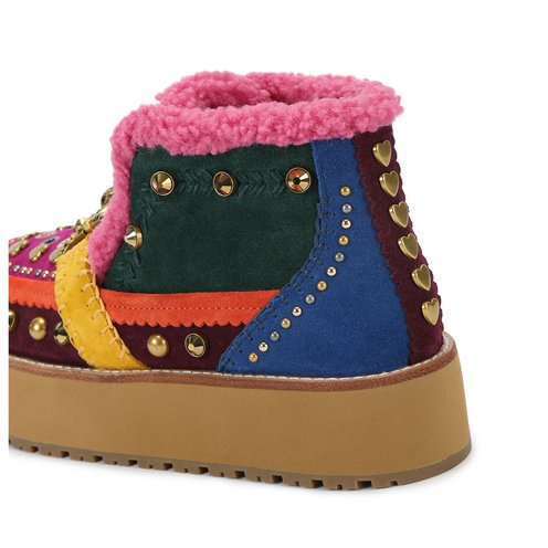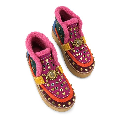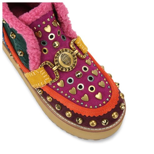 This Mansion Cosy Boot is crafted from a multi-colour suede which is embellished with antiqued brass studs and crystals. There is an antiqued brass eagle chain across the toe and the lining on the boot is in a pink fabric.
