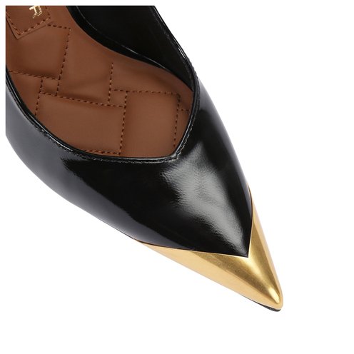 This Regent Point Court heel features a patent black leather upper. There is a brushed brass tip on the pointed toe.