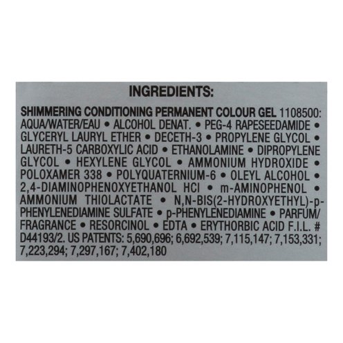 Shimmering Conditioning Permanent Colour Gel 1108500: Aqua/Water/Eau, Alcohol Denat., PEG-4 Rapeseedamide, Glyceryl Lauryl Ether, Deceth-3, Propylene Glycol, Laureth-5 Carboxylic Acid, Ethanolamine, Dipropylene Glycol, Hexylene Glycol, Ammonium Hydroxide, Poloxamer 338, Polyquaternium-6, Oleyl Alcohol, 2.4-Diaminophenoxyethanol HCl, M-Aminophenol, Ammonium Thiolactate, N,N-Bis(2-Hydroxyethyl)-Pphenylenediamine Sulfate, P-Phenylenediamine, Parfum/Fragrance, Resorcinol, EDTA, Erythorbic Acid, Shimmering Conditioning Developer Creme 437047 U: Aqua/Water/Eau, Hydrogen Peroxide, Cetearyl Alcohol, Trideceth-2 Carboxamide MEA, Ceteareth25, Glycerin, Pentasodium Pentetate, Sodium Stannate, Tetrascdium Pyrophosphate, Phosphoric Acid, Aromatic Shimmer Serum 1183532: Helianthus Annuus Seed Oil/Sunflower Seed Oil, Parfum/Fragrance, Cocos Nucifera Oil/Coconut Oil, Poly(Linseed Oil), Power Shimmer Conditioner 1025948 E: Aqua/Water/Eau, Cetearyl Alcohol, Glycerin, Behentrimonium Chloride, Amodimethicone, Cetyl Esters, Isopropyl Alcohol, CI 77891/Titanium Dioxide, Mica, Sodium PCA, Phenoxyethanol, Theobroma Cacao Seed Butter/Cocoa Seed Butter, Trideceth-5, Trideceth-10, Chlorhexidine Dihydrochloride, Parfum/Fragrance, Methylparaben.
