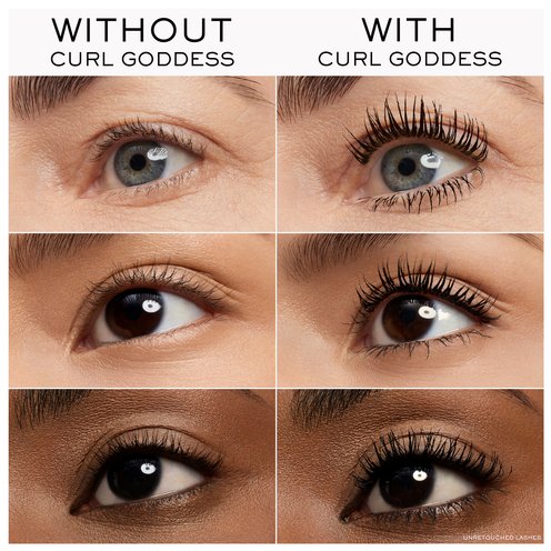 Curl Goddess Mascara delivers 1.5x curl boost and +800% lash volume. Inspired by hair styling technology, the fast-setting formula rapidly locks and sets the curl at the root, no weigh down.