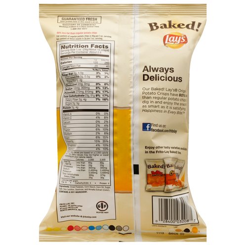 Guaranteed fresh until printed date. 80% less fat than regular potato chips. Fat content of regular potato chips is 10 g per 1 oz. serving; fat content of these snacks is 2 g per 1 oz. serving. Always Delicious: Our Baked! Lay's Original Potato Crisps have 80% less fat than regular potato chips. So dig in and enjoy the snack that's as smart as it is satisfying. Happiness in every bite.