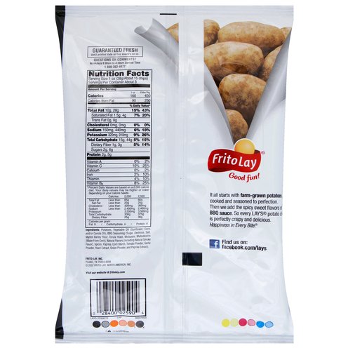 Guaranteed fresh until printed date. Good fun! It all starts with farm-grown potatoes cooked and seasoned to perfection. Then we add the spicy sweet flavors of BBQ sauce. So every Lay's potato chip is perfectly crispy and delicious. Happiness in every bite.