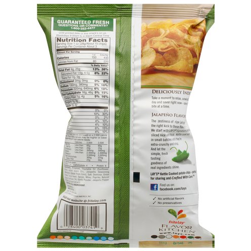 Crafted with care - Fresh taste of Lay's signature potatoes. Guaranteed fresh. Deliciously Indulge: Take a moment to relax, unwind from your day and savor right now - one delicious bite at a time. The zestiness of ripe jalapenos adds just the right kick to these flavorful chips. We start with Lay's signature potatoes, sliced nice and thick. Kettle cook'em in small batches until they're extra-crunchy and crisp. And let the simple, fresh tasting goodness of real ingredients shine. Lay's Kettle Cooked potato chips - perfect for sharing and crafted with care.