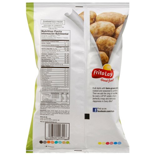 Lime flavored potato chips. Guaranteed fresh. Good fun! It all starts with farm-grown potatoes - cooked and seasoned to perfection. Then we add the zing of real lime. So every Lay's potato chip is perfectly crispy and delicious. Happiness in every bite.