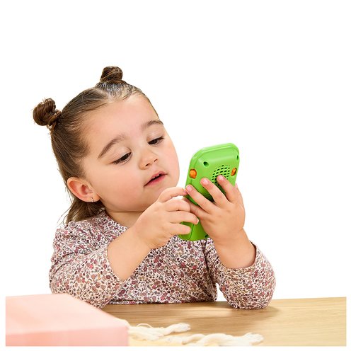 Laugh and listen to a personalized message recorded and saved to the phone! Record a heartfelt message for up to 10 seconds in length, then save it for little ones to listen to again and again, letting them know they are loved. The voicemail button lights up, engaging the curious tendencies of infants and toddlers while introducing cause and effect. Add some voice-changing effects or remix the message into a song with the slider bar. Explore different apps and press the easy-touch buttons to hear about letters, numbers, animals, weather, daily routines and more. Phrases in Spanish and Mandarin introduce foreign languages in a cute way. Hola! That is hello in Spanish! Encourage pretend play with sound effects and silly songs, or even call Scout and his animal friends. Ring ring, let’s play! Intended for ages 6+ months. Requires 3 AAA batteries. Batteries included for demo purposes only. New batteries recommended for regular use.