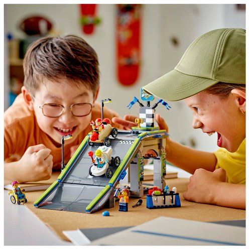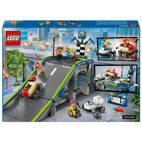 Elevate your child's playtime excitement with the LEGO® City No Limits: Race Car Ramp Track (60460) toy for ages 6 and up. This dynamic soapbox racing set features a towering toy car ramp and 2 unique soapbox race vehicles. Watch as kids place thequirky hot dog and toilet cars at the ramp’s peak and flick a lever to send them hurtling from the start line. Complete with 4 minifigures, including hot-dog vendor and plumber drivers, this set inspires imaginative play and storytelling. This LEGO soa pbox race car kit includes a printed construction guide. Kids can also enjoy a fun building adventure with the LEGO Builder app, where they can zoom in, rotate the models in 3D, track their progress as they build, and explore and save other playsets. LEGO City playsets feature cool vehicles, realistic structures and fun characters for play without limits. Kids can add this soapbox car set to others (sold separately) from the LEGO City range to expand their world of play possibilities.