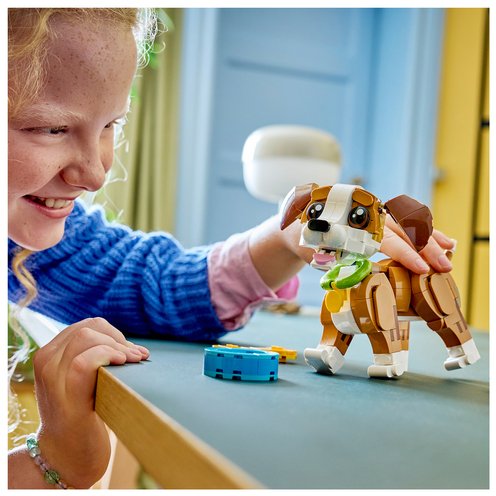 LEGO® Creator 3 in 1 Cute Animals: Playful Puppy Dog (31382) building set lets kids ages 8 and up play out fun-filled stories. This cute animal toy for girls and boys offers 3 different building options with the same set of bricks. Kids can choose to build a toy dog with a posable head, ears, legs, tail, brows and mouth, which comes with a collar, toy bone and a water bowl. This can be rebuilt into a squirrel toy with a posable head and tail holding an acorn, or a duck model with a posable head and a greenery-filled pond. Once playtime is over, each model can be proudly displayed. This 3 in 1 animal set will inspire kids’ imaginations and makes a cute gift for girls and boys who love pretend play. Kids can build each playset with confidence using the LEGO Builder app – zoom, rotate in 3D and track progress with easy-to-follow digital instructions. Please note models cannot be built simultaneously. Set contains 336 pieces.