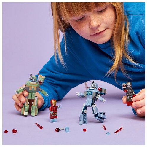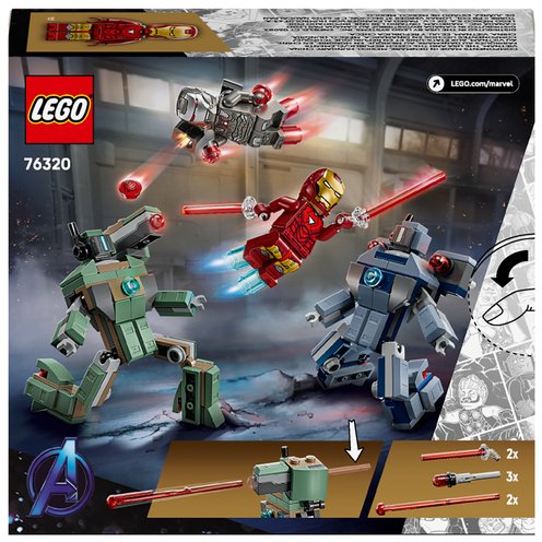 Iron Man & War Machine vs. Hammer Drones (76320) is a buildable Super Hero toy for kids who like battle action with LEGO® ? Marvel collectibles. With fun features and cool weapons, this small gift for kids makes an ideal Super Hero present for boys and girls aged 7 years old and up. This buildable toy recreates the epic battle scene from Marvel Studios’ Iron Man 2 movie. It comes with Iron Man and War Machine minifigures and 2 buildable Hammer Drones. The Hammer Drones are fully jointed so kids can pose the buildable figures for realistic dynamic play. The green Hammer Drone has a spring shooter on its shoulder. The blue Hammer Drone has a push shooter on each shoulder. War Machine has red hand and feet blasters and a stud shooter on hisshoulder. Iron Man has blue hand and feet blasters and can hold laser beam elements. For added digital fun, builders can zoom in, rotate models in 3D and track their progress using the intuitive LEGO Builder app. Contains 204 pieces.