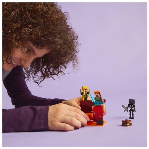 The Nether Lava Battle (21266) is a small LEGO® Minecraft® set that provides a build-and-play version of the popular video game. This versatile Minecraft activity set features popular gaming figures, fun features and endless action, making it the perfect treat for kids aged 6 and up. Kids join Minecraft action hero Alex on a mission to remove ancient debris from a section of the Nether fortress bridge in the crimson forest. When the debris is removed, lava elements automatically cascade down, and Minecraft figures – a stone-sword wielding wither skeleton and a rod-spinning blaze – block Alex’s escape. Kids use an iconic diamond sword to battle the mobs before fleeing on another Minecraft figure, a strider, which features posable legs anda saddle. Minecraft players know they must grab hold of some warped fungus to be able to steer the strider. For extra digital fun, the LEGO Builder app lets kids zoom in and rotate models in 3D using their device.