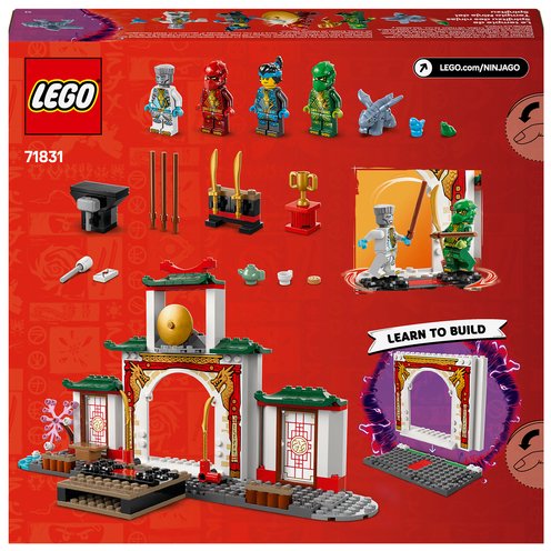 Delight ninja toy-loving kids with the LEGO® NINJAGO® Ninja Spinjitzu Temple (71831). This dragon toy playset allows children aged 4 and up to recreate adventures from season 3 of the NINJAGO Dragons Rising TV show. This ninja toy role-play set isideal for pretend play with a NINJAGO tournament stage, garden, teahouse and weapons training area. This LEGO set comes with 4 NINJAGO minifigures: Zane, Nya, Kai and Lloyd, plus a Baby Riyu dragon toy so kids can role-play ninja action. The minifigure s can be placed on 2 turning plates for epic battles, and for added play value there is a large range of accessories: ninja weapons including 2 swords and 3 staffs, as well as a hammer, bird, frog, trophy, cookie and letter. This ninja toy has been designed to provide a fun experience for children aged 4 and up who are discovering the joy of building with LEGO bricks. The adventure toy comes with a Starter Brick – a partly constructed base that gets kids building quickly and with confidence.
