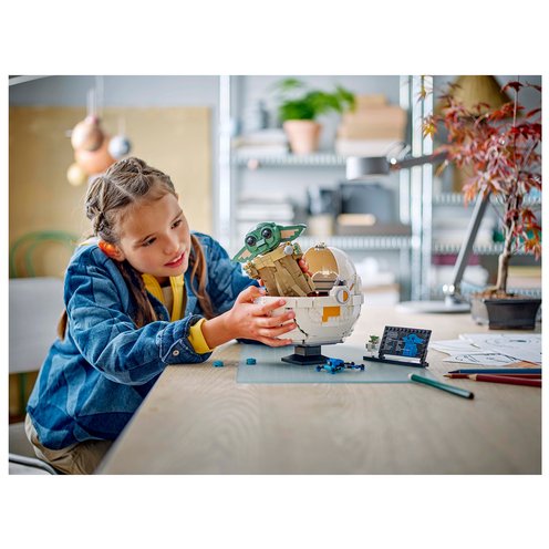 - Grogu LEGO® figure – The main buildable toy model comes with a Grogu information plaque on a stand with space for the included standard-size Grogu LEGO figure in a small buildable hover pram