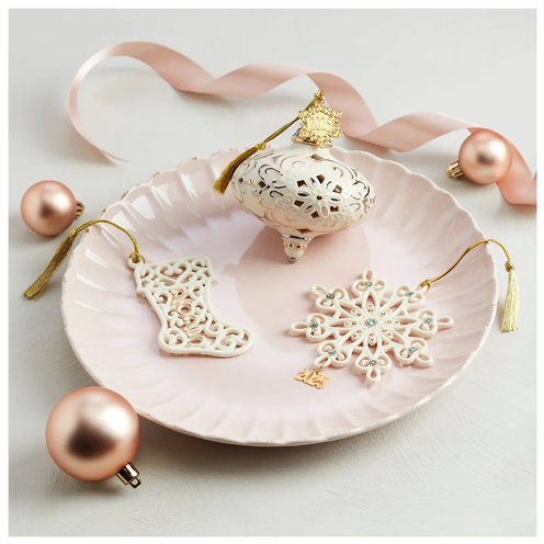 Every year Lenox delights the Christmas lover with a new annual ornament in a traditional shape, each crafted in signature ivory porcelain with shining gold accents. Our 2025 Lenox annual is a classic onion-shaped style with with wintry snowflake cutouts. It's perfect for a white Christmas theme, Lenox lovers, and collectors!