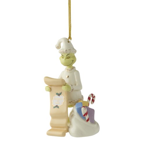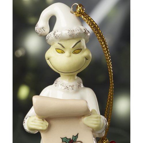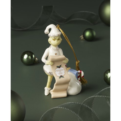 Bring some mischief to your tree with this Grinch ornament, featuring the iconic character caught mid-scheme with a list in hand. Crafted with vibrant colors and playful details, it's a cheeky nod to the classic Dr. Seuss tale. Perfect for those who love a little sass with their seasonal decor.
