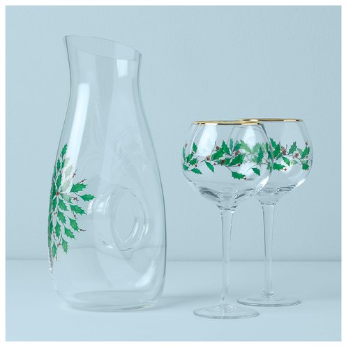 Enjoy a special night in with your #1 with these 24k gold-accented wine glasses with decanter. Featuring our best-selling Holiday pattern of holly leaves and berries, it's bound to be a conversation starter. You'll appreciate the balloon shape of the glasses, not just for its beauty; it's ideal for helping your wine breathe!
