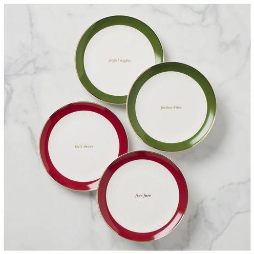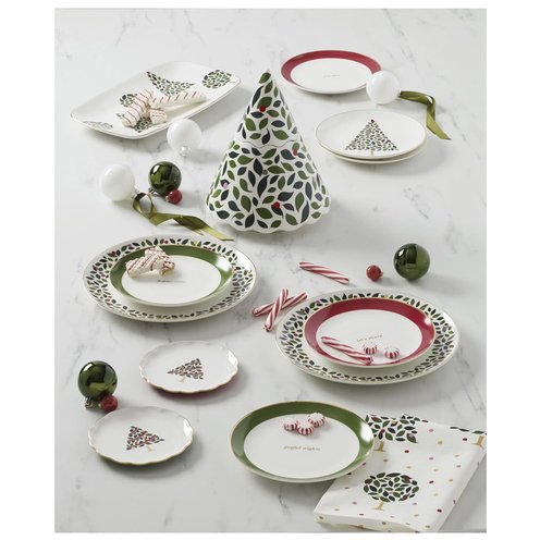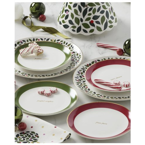 Add festive flair to your home and table with these Evergreen accent plates from kate spade new york. Decorated with cheerful holiday colors and fun spirited phrases, these plates are perfect for playful Christmas celebrations.