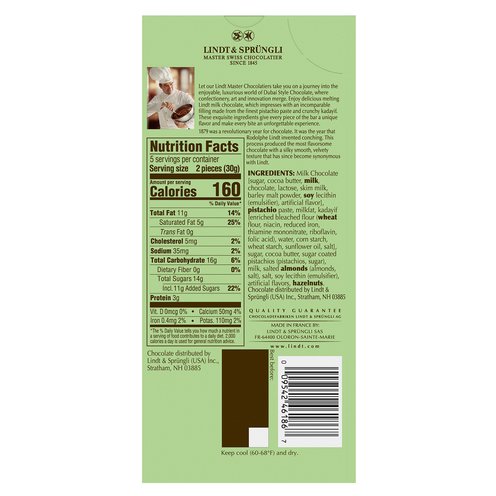 Indulge in the luxurious taste of Lindt Dubai Style Chocolate Bar, a masterpiece crafted by the Lindt Master Chocolatier. This exquisite chocolate candy creation features the finest Lindt chocolate, filled with a rich and creamy pistachio filling, boasting 45% pistachio for an unparalleled flavor experience. Delight in the crispy texture of kadayif threads and the irresistible crunch of almond brittle, perfectly complementing the smooth pistachio cream.