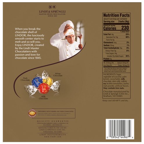 Remind a friend or loved one of how much they mean to you this holiday season with Lindt LINDOR Assorted Chocolate Truffles Gift Box. Packaged in a festive modern gift box, these holiday chocolate candy truffles make perfect ready-to-give gifts and stocking stuffers for family and friends. Each of the truffles in this assortment are finely crafted with either a milk chocolate, dark chocolate or white chocolate shell that envelops an irresistibly smooth, melting truffle filling. When you break the truffle's shell, LINDOR starts to melt and so will you. Lindt LINDOR truffles are individually wrapped, making them perfect for enjoying anytime and anywhere, whether you're savoring a moment for yourself or sharing with others. Lindt chocolates embody the passion and expert craftsmanship of Lindt Master Chocolatiers for a luscious and rewarding chocolate experience. Made to Melt You. Anytime. Anywhere.