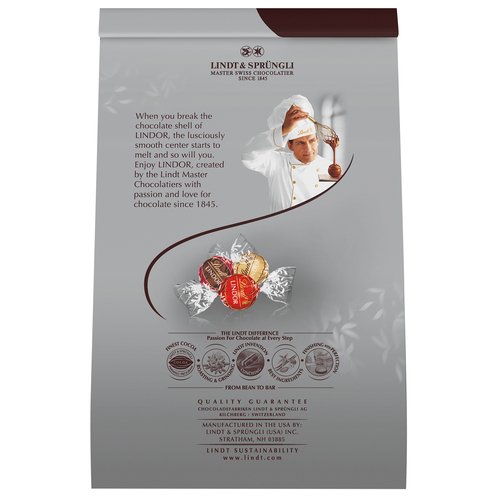 Experience the most popular flavors of Lindt LINDOR assorted chocolate truffles in this classic five flavor assortment. Surprise friends and family with a chocolate candy gift, or share a piece of Lindt LINDOR chocolate truffles as a sweet, indulgent after-dinner treat. Each bag features Milk Chocolate, White Chocolate, Dark Chocolate, Caramel Milk Chocolate and 60% Extra Dark Chocolate truffles. There is something for everyone, whether you prefer the classic taste of milk chocolate truffles, slightly intense dark chocolate or smooth and sweet white chocolate truffles or chocolate caramel recipes. Smooth, melting, luscious. When you break the shell, the truffle's smooth center begins to melt and so will you. These individually wrapped truffles are the perfect size to enjoy anytime, anywhere. Lindt chocolate embodies the passion and expert craftsmanship of Lindt Master Chocolatiers for a luscious and rewarding chocolate experience. Made to Melt You. Anytime. Anywhere. In addition to the five flavors in this assortment pack, Lindt LINDOR Truffles are also available in an array of other irresistible flavors, including hazelnut and sea salt milk chocolate.