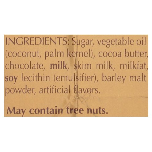 Ingredients: Sugar, Vegetable Oil (Coconut, Palm Kernel), Cocoa Butter, Chocolate, Milk, Skim Milk, Milkfat, Soy Lecithin (Emulsifier), Barley Malt Powder, Artificial Flavors.