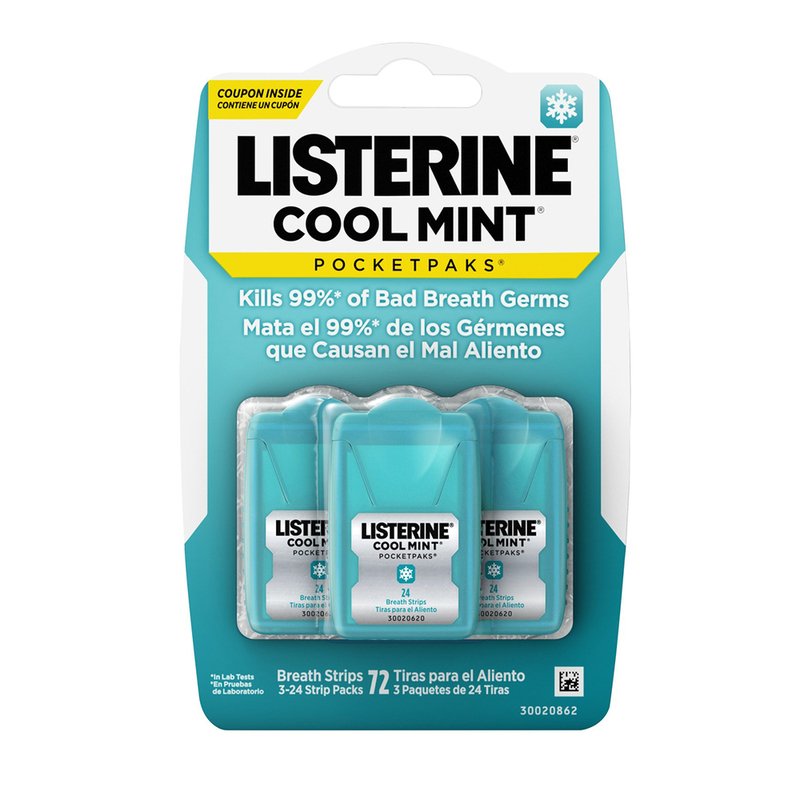 Refresh your bad breath with Listerine Cool Mint Pocketpaks Breath Strips for bad breath. These refreshing mint breath strips dissolve instantly, killing 99 percent of germs that cause bad breath.* Conveniently portable to freshen breath on-the-go, slip your pack into your purse or pocket, so you can easily get fresh breath and kill bad breath germs after your morning coffee, or before an important meeting or date. Each fresh breath strip has a refreshing Cool Mint flavor to leave your mouth feeling clean and fresh. *In laboratory tests.
