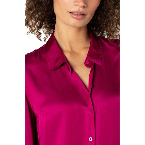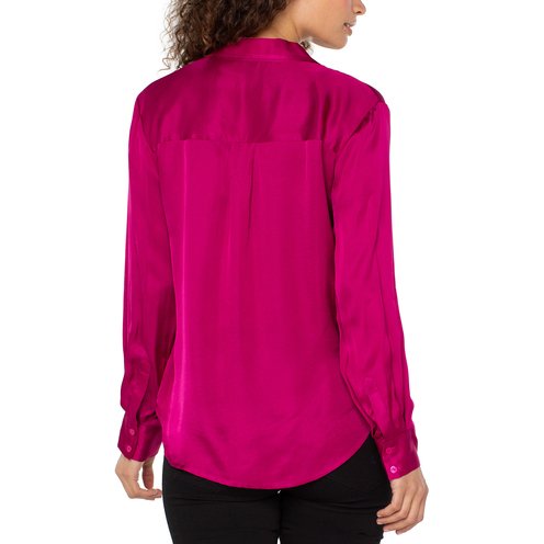 This long sleeve woven shirt is designed in a lustrous fabric that catches the light with every move. Featuring a classic collar, button front, and refined back box pleat, it delivers an effortless balance of polish and ease. Finished with buttoned cuffs and a curved hem for versatile styling - wear it tucked, tied, or layered for an elevated take on everyday dressing.