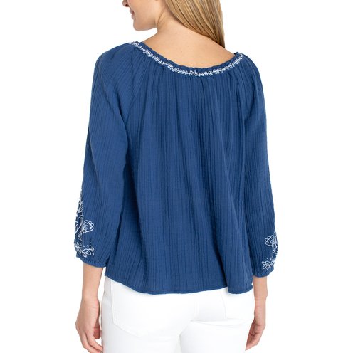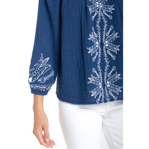 Embroidered detailing and a gently shaped neckline give this woven top quiet character