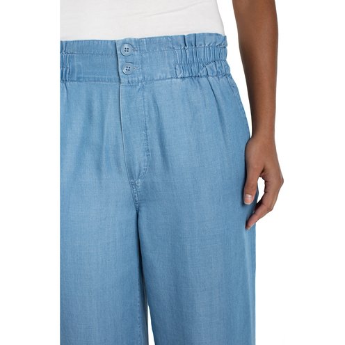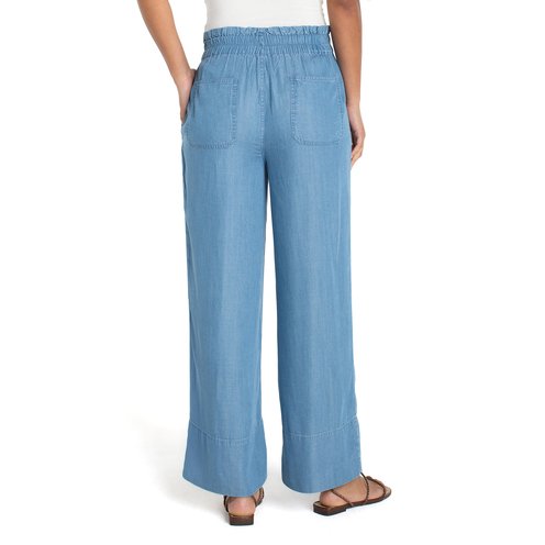 This pull on silhouette features an indigo slub fabrication and an elastic smocked waistband for effortless comfort. Lightweight, relaxed, and made for getaway dressing.
