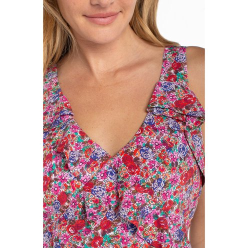 An effortless maxi with soft structure from Liverpool Los Angeles. Ruffle details at the V-neckline and waist create easy shape, while the simple skirt keeps it light and wearable.