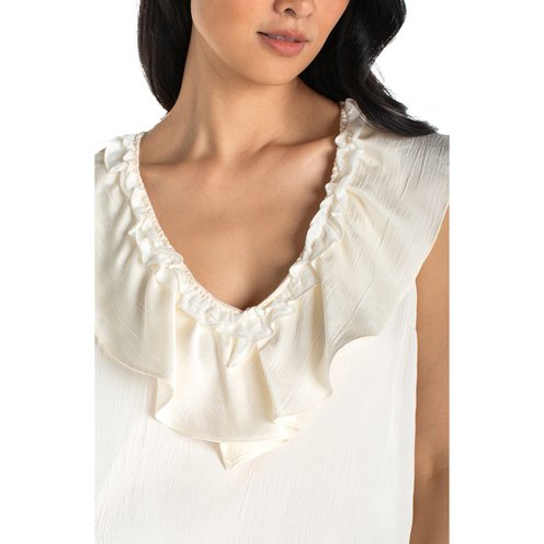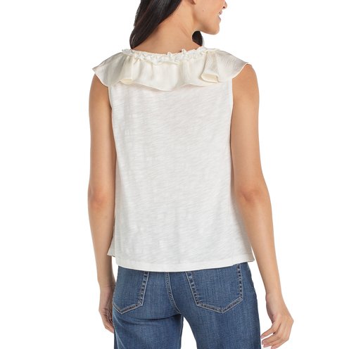 This sleeveless top is defined by a ruffle accented neckline and a clean, fluid silhouette. The contrast between woven and knit fabrics adds depth, making it an easy piece to dress up or down.