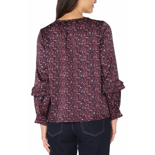 Romantic movement in every detail. This woven blouse features ruffle accents, soft shirring, and a flowing silhouette-finished in a rich burgundy multi print for a statement that feels both modern and timeless.