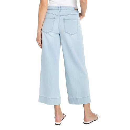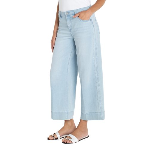 This crop wide-leg jean pairs a relaxed shape with thoughtful detail. Embroidered side seams add subtle interest to a light wash finish, while the mid rise fit keeps it comfortable and versatile.